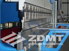 本系列液壓折彎機是雙缸上動式的數(shù)控液壓折彎機,它通過伺服比例閥上的各類閥門動作來驅(qū)動左右油缸的伸長與返回,從而帶動滑塊的上升與下降。滑塊的同步采用全閉環(huán)電液伺服控制技術(shù),滑塊位置信號由兩側(cè)光柵尺反饋給數(shù)控系統(tǒng),再由數(shù)控系統(tǒng)控制同步閥的開口大小,自動調(diào)節(jié)油缸進油量的多少,從而控制滑塊(Y1、Y2)軸的同步運行,始終保持對工作臺的平行狀態(tài)。