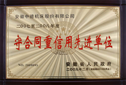 近日,我公司榮獲由安徽省人民政府頒發(fā)的二〇〇七至二〇〇八年度“守合同重信用先進(jìn)單位”榮譽(yù)稱號(hào)(證書號(hào):2009095,有效期止2011年2月),也是我公司第二次獲得此項(xiàng)殊榮。